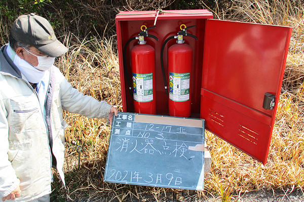 タウン内12箇所に消化器ボックス(各2本)を設置。年2回の点検や自主防災委員による消火訓練も実施。
