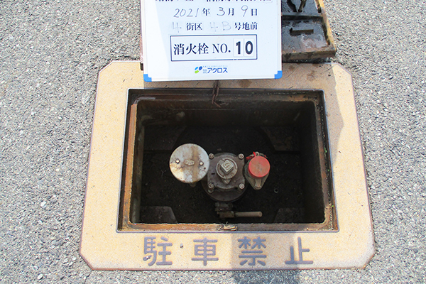 タウン内10箇所、タウン入口前の市道に1箇所、消火栓を設置。消防署員立会いで年2回の点検を実施。