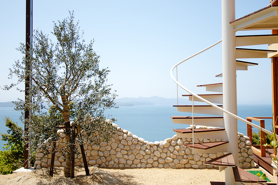 螺旋階段、オリーブの木、曲線を生かした石詰みの塀越しに見える四国・徳島の山並み。絵になる風景です。