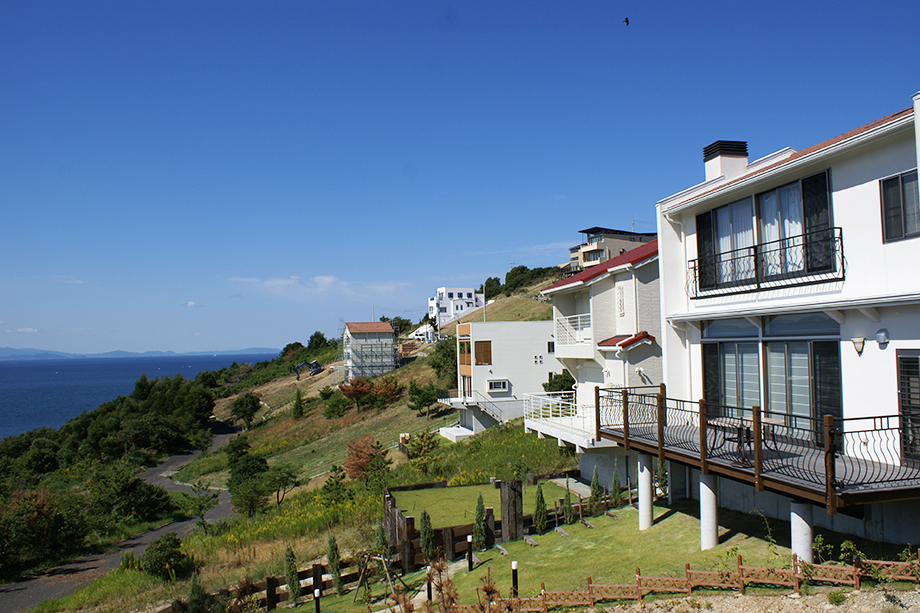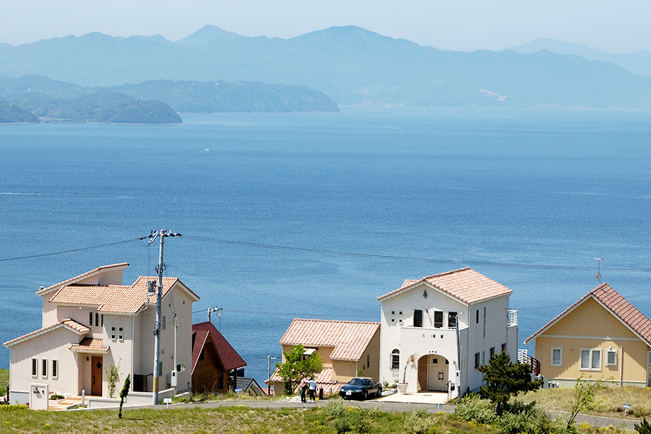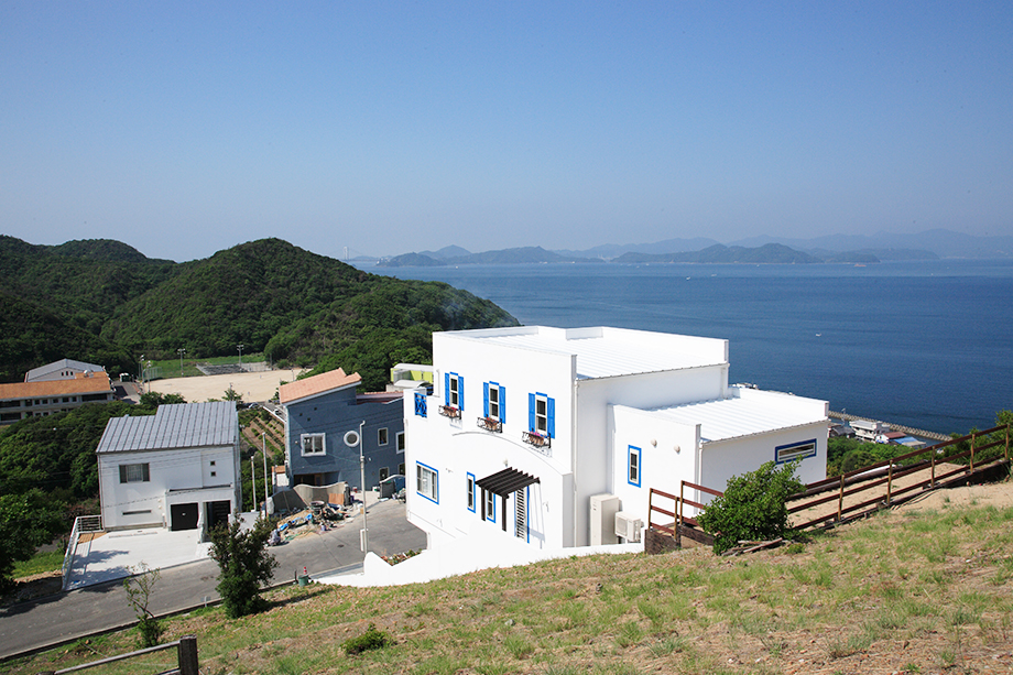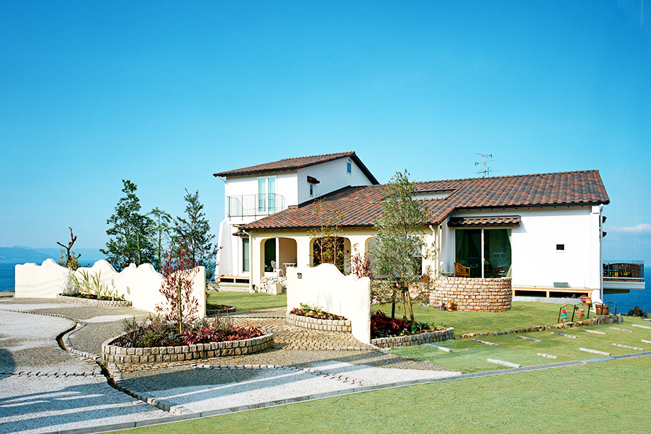 四国を望む南面傾斜に立つ真っ白な建物。エーゲ海に浮かぶサントリーニ島の建物をイメージした別荘。