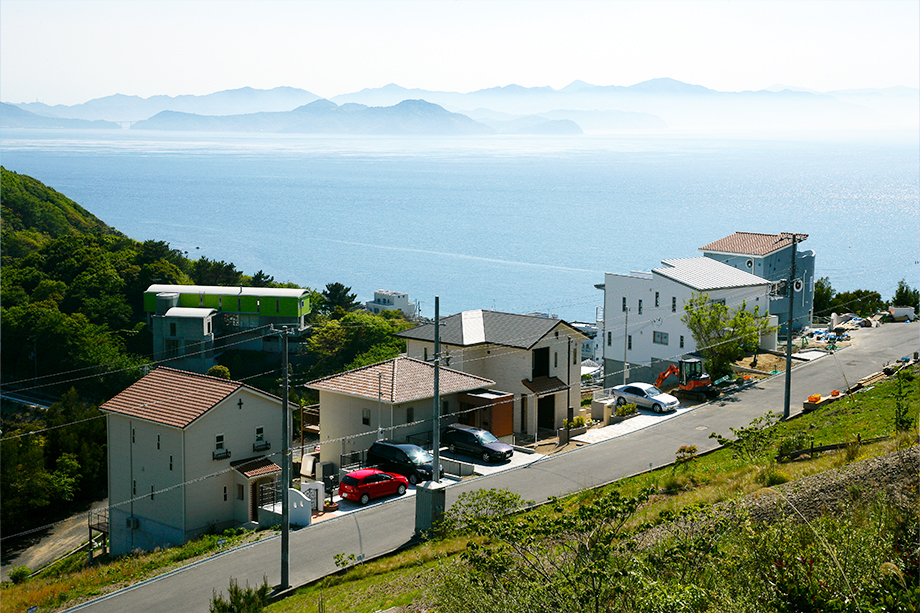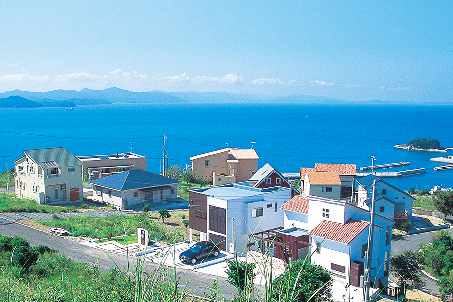 陽当たりの良い南向き傾斜を生かしたお庭と海を望むデッキテラスが並ぶ1街区の街並み。
