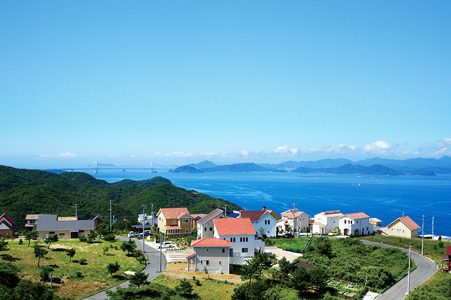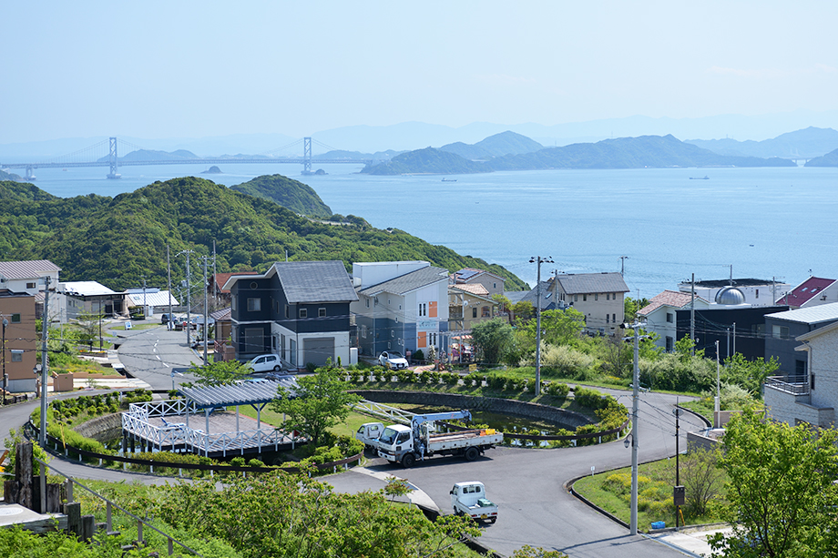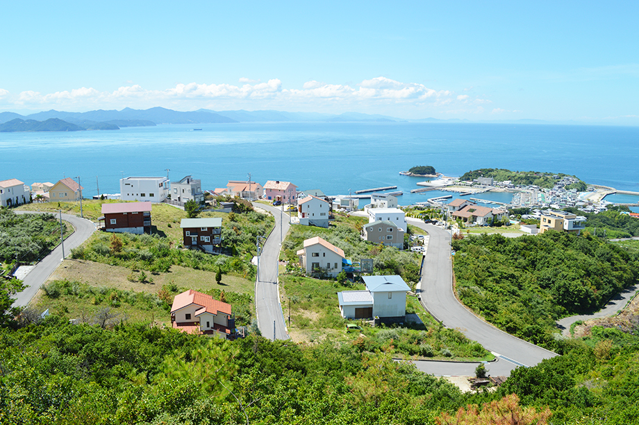 タウン高台から見た瀬戸内海と四国・徳島の島影。右手に見えるのは弁天島です。