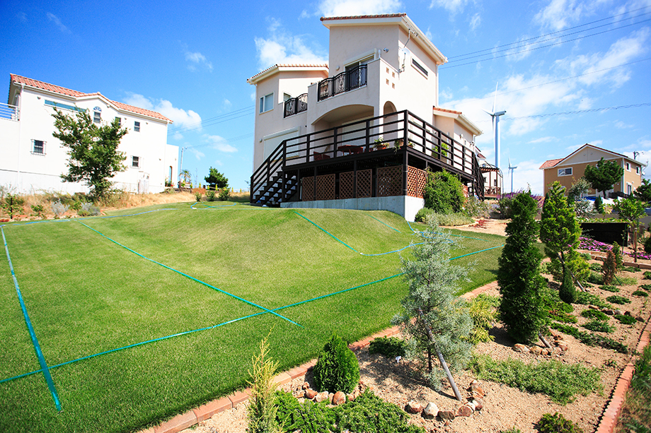 真っ青な夏空に映える白い邸宅と緑の芝生。ゆとりの敷地で空も広く感じられます。