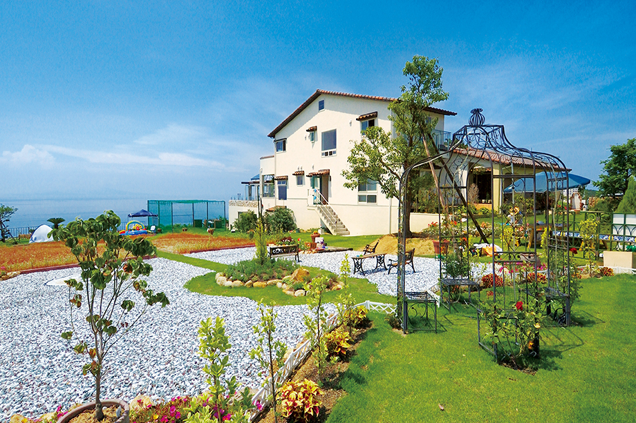 広い敷地にゆったりと建つ南欧風の邸宅。吹抜けの中庭やプライベートシアターなど、リゾートライフを満喫できる施設を装備。