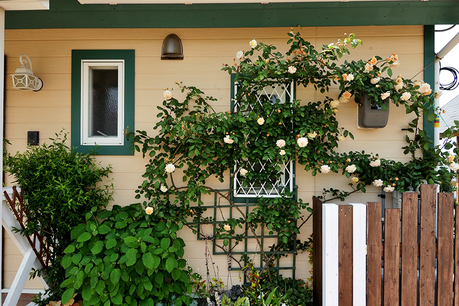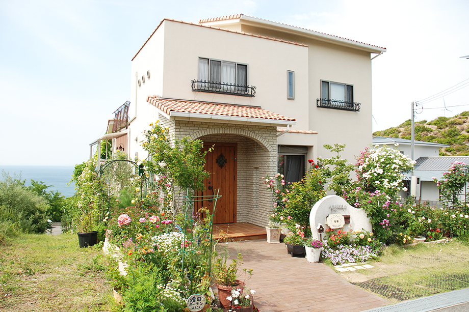 色とりどりのバラの花に囲まれた素敵なお庭。オーナー様の庭づくりへの愛情が感じられるガーデニング。