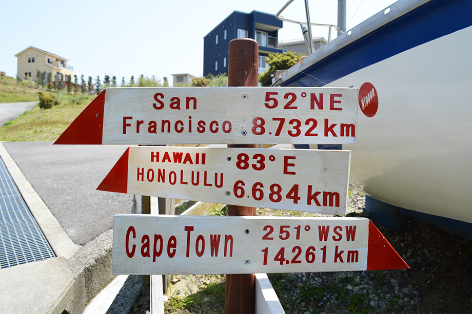 各都市への距離と緯度経度を表示したサイン。元ヨットマンのオーナーらしい遊び心溢れるアイデア。