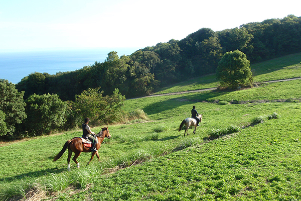 海を一望する高原の牧草地帯にある乗馬クラブ。花畑の中を海を見ながら爽快な乗馬体験ができます。