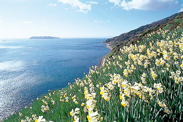 水仙の日本三大群生地の一つ。海に落ち込むような約7haの斜面に無数の水仙が一斉に花開きます。
